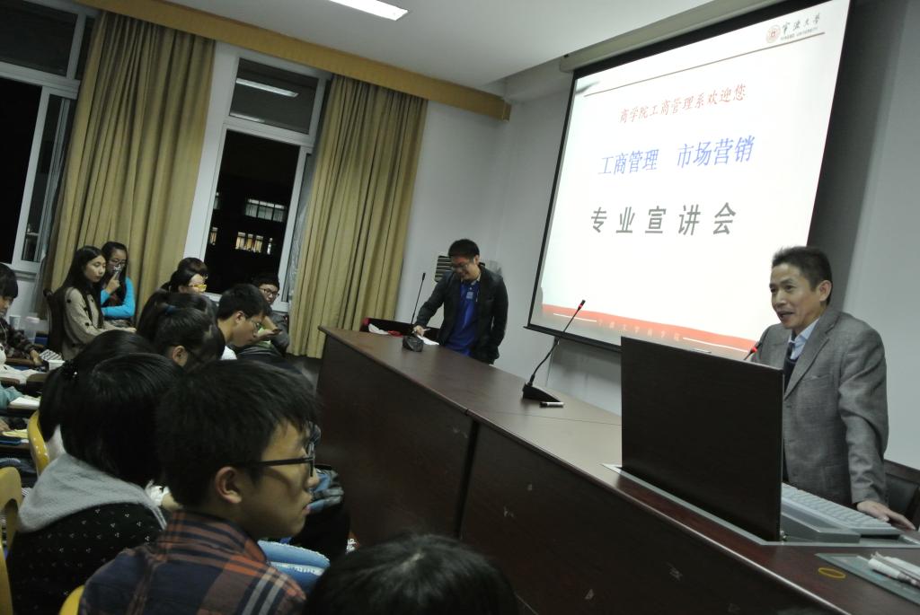 宣讲会伊始,张聪群老师对到会的阳明学院的同学们表示热烈欢迎,并从工商管理系建立谈起,为同学们介绍工商管理系的历史与现状。工商管理专业负责人白泉旺老师从教师的角度系统地为大家分析了工商管理专业的特点,市场营销专业负责人周艳春老师从“苹果”“双十一淘宝”等案例入手,生动地为同学们介绍“营销是什么”,风趣幽默的语言多次引得台下掌声如雷。