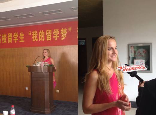 2013浙江省高校留学生“我的留学梦”演讲比赛是浙江省外国留学生第七届“梦行浙江”系列活动的一项重要活动之一,鼓励外国留学生讲述自己的留学故事、与浙江的情缘、发现浙江最美的人、最美的事等,并推荐产生本届“梦行浙江”外国留学生中华才艺展演活动的主持人,增进他们对浙江的感情。比赛邀请了专业的评委老师,全省共有50名高校留学生参加,捷克论坛 碧海同学是45号出场。可人的外形、自信的笑容、精彩的留学梦给在场的评委以及观众留下深刻的印象,大家记住了这位喜欢汉语的金发女孩。据悉,碧海还代表我校参加中央电视台的《五月的鲜花》五四晚会。