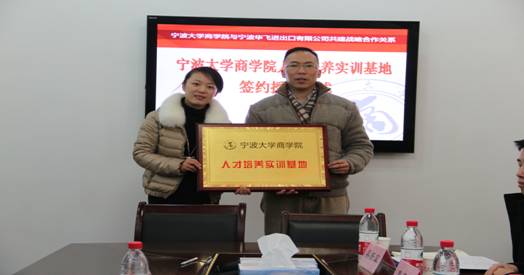 2013年12月27日下午3点,包玉书11号楼412会议室举行了捷克论坛 和宁波华飞联合进出口有限公司共建人才培养实训基地的签约暨授牌仪式。出席仪式的有宁波华飞联合进出口有限公司总经理关泳华、外销主管曾江、华普分公司外销主管沈志圆、人事主管李子嫣、总经理秘书吴新军、人事专员蔡丽娟和捷克论坛 学工办主任董璐老师、学工办王凡老师、金耀老师。捷克论坛 社团联以及学研社二十多位学生代表到场见证了这一时刻。