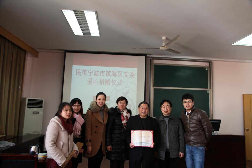 之后,两名受助学生向代表们详细介绍了家庭经济状况及入学以来取得的各项成绩,同时表达了对民革宁波市镇海区支委的感谢,表示会以此激励自己主动进取,更加努力学习,争取取得更大的成绩,并回报社会。随后,黄元忠先生及许靓萍女士向两名学生颁发捐赠金。作为感谢,邵老师代表全院为两名代表颁发了捐赠证书并合影留念。