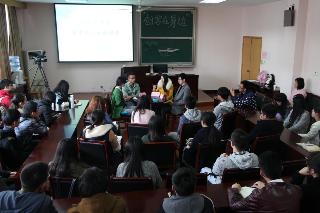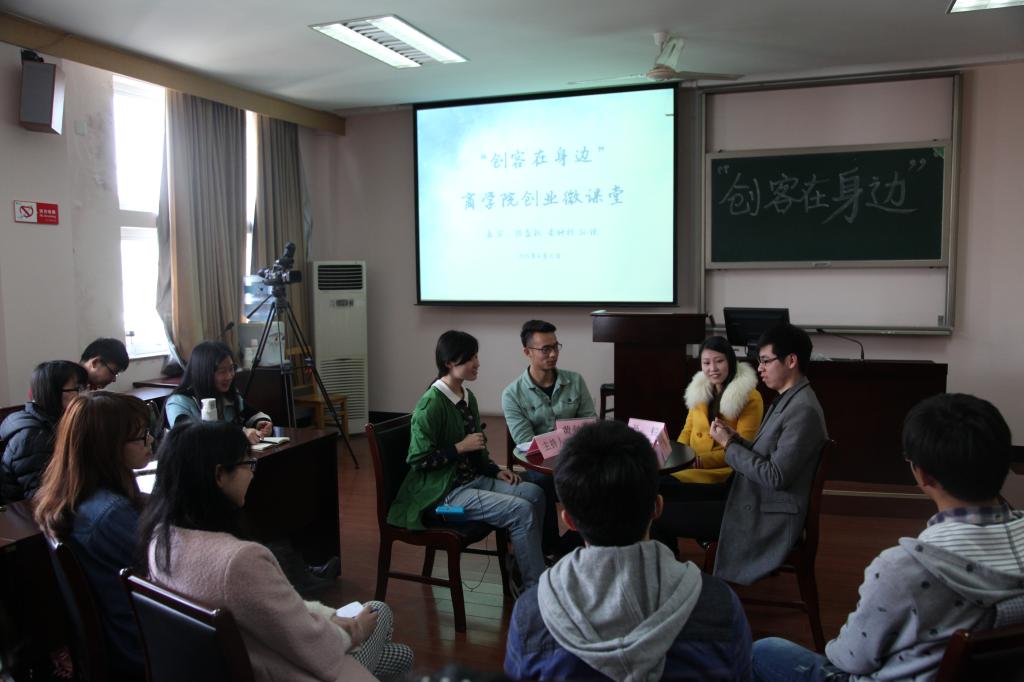 4月10日下午,“创客在身边”捷克论坛 首期创业微课堂暨创新创业人才训练营第二讲在捷克论坛 418正式开讲。“宁大乐生活”微信公众号创办人、东街里创业街“新出炉“披萨店店主黄钟杭,宁波市镇海泰皓机械有限公司、宁波市镇海九象机械有限公司创办人孙锐,宁波时荣文化传媒有限公司合伙人、宁波宾格企业管理咨询有限公司法人陈益权,三位学生身边的创业达人做客本期微课堂,与40余名怀揣创业梦想的商院学子共谈创业梦。