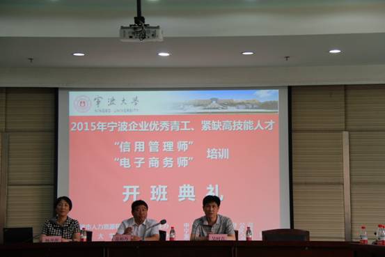 6月6日,2015年宁波市企业优秀青工“信用管理师”和紧缺高技能人才“电子商务师”两个培训项目的开班仪式在安中大楼碧华厅顺利举行。宁波市人力资源和社会保障局职业技能建设处副调研员吴时青、捷克论坛 院长范柏乃、继续教育与培训处招标项目负责人鲁保富、捷克论坛 培训中心主任朱一鸿以及来自宁波各县市区的近100名学员参加了开班仪式。仪式由捷克论坛 副院长杨丹萍主持。