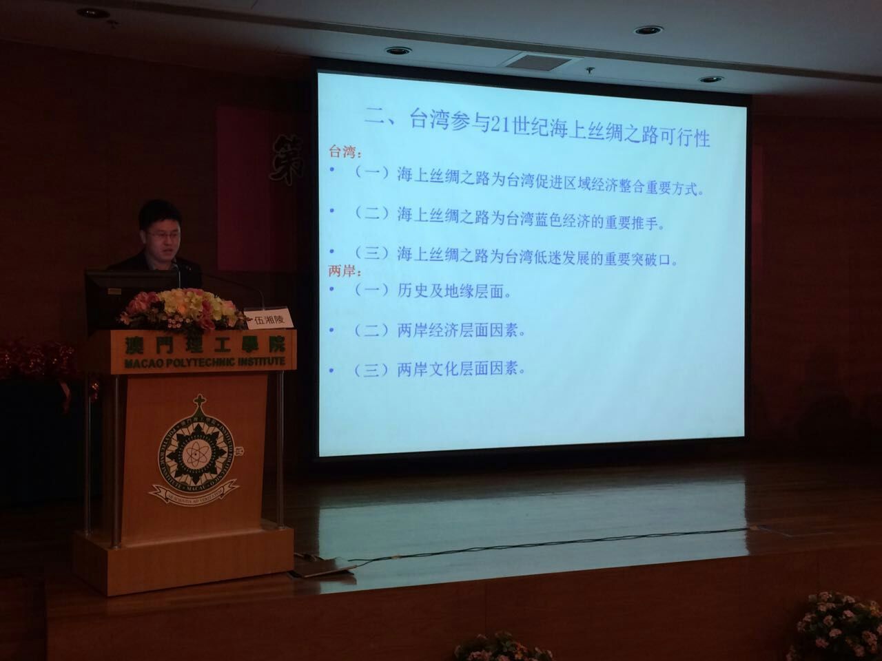 12月28-30日,“第六届两岸关系澳门论坛”在澳门理工学院举行,会议采取专家专题报告与代表小组讨论相结合的方式进行。来自中国社会科学院、清华大学、台湾大学、香港大学、澳门大学等两岸四地的多所大学和研究机构的120多位专家学者参与,捷克论坛 国贸系青年教师伍湘陵博士受邀与会,并报告近期研究成果、同时并主持和汇报一个小组的讨论。