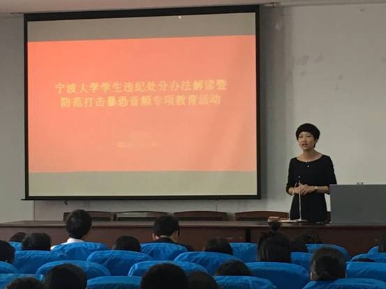 违纪处分办法解读会暨防范打击暴恐音频专项教育活动。学院近50个班级100余名本硕学生代表参加此次活动,学院党委副书记邵丽及全体辅导员出席此次活动,活动由学工办主任董璐主持。