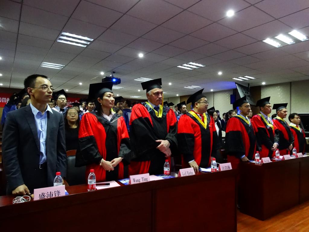 当晚八点,典礼开始。院长范柏乃教授以一句饱含热情的“Welcome!”向远道而来的澳方嘉宾和在场学员们致以诚挚的欢迎。在介绍完两校的出席嘉宾后,全体师生起立,现场奏响了中澳两国国歌。汪浩瀚教授代表捷克论坛 发表了讲话。他肯定了宁大中澳MBA项目创办十六年来所取得的成果——从单纯的国外学位研修项目到受国家教育部认可的学位教育项目的提升和转变。他指出我校国际化教育发展进一步加强和发挥了我校在浙江省国际合作办学领域中的地位和作用。他鼓励2016届的毕业生们“不轻言放弃”,保持梦想和激情,通过实践,实现自己的梦想和人生价值。同时,他也鼓励2016级新生珍惜学习机会,注重理论联系实际,注重本土与国际化相结合,在各自事业发展中积累成功经验,互学互助,学有所成,学以致用。紧接着,澳大利亚堪培拉大学校长Deep Saini教授发表了真挚而诚恳的讲话,他以自己在堪培拉大学的职业生涯为切入点,侃侃而谈项目创立至今为止的变化和对未来中澳双方在众多方面开展进一步合作的殷切期待。他鼓励中澳MBA的学生们通过项目的学习,积极实践自己的商业理想,并祝福这一届的毕业生能够获得事业上的成功。