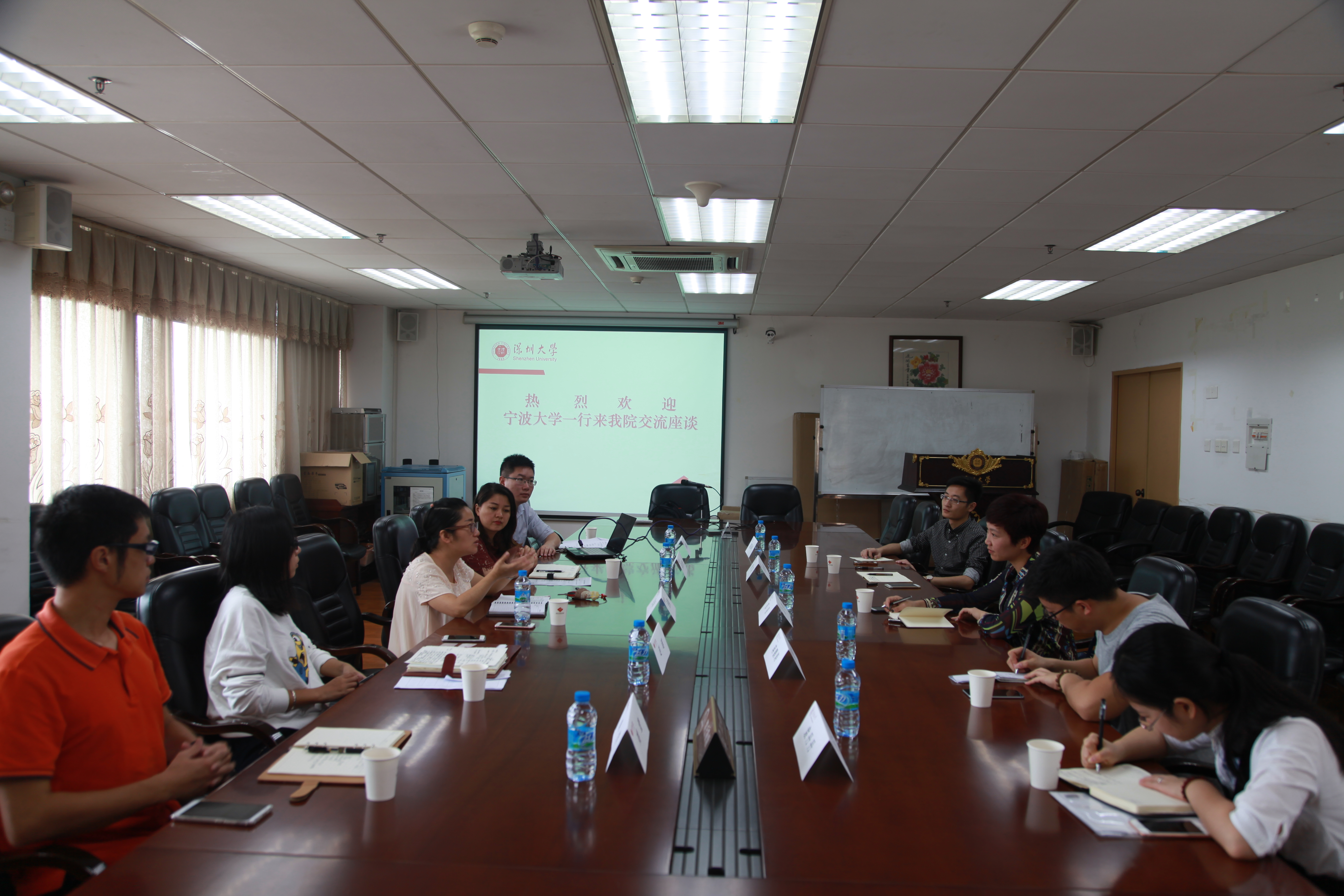 当天上午,考察组来到深圳大学。深圳大学经济学院副书记张颖、学工办主任陈应怡等五位老师出席了交流会。会上,深圳大学经济学院张颖副书记详细介绍了经济学院学生工作的概况和特色。双方就学生党建、团学活动及学生事务管理等工作分享了各自的工作经验,同时就本科生导师作用的发挥和学生事务管理中心的运作模式进行了探讨。