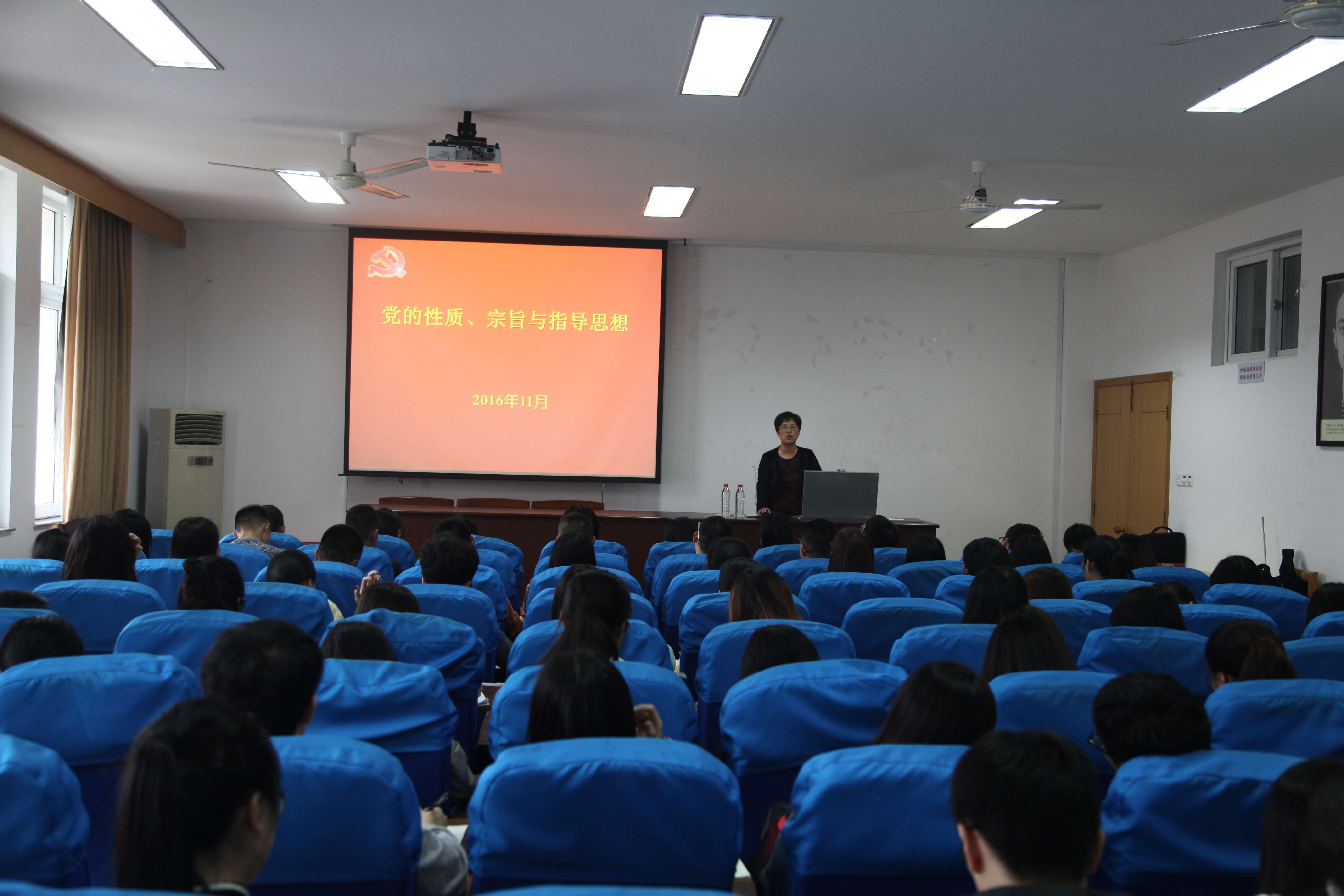 党课上,胡书记首先对入党积极分子学员提出了四点要求:一、通过学习,进一步端正入党动机;二、通过学习,进一步坚定理想信念;三、通过学习,进一步增强表意识;四、对照标准,查补短板,以实际行动争取入党。要求同学们要讲政治,有信念,忠于共产主义事业,端正入党动机,坚定理想信念。接着,胡书记从党的性质、宗旨、指导思想等角度向同学们介绍党的知识,使入党积极分子学员对党有了更加深入的了解。学员们认真听取讲座内容,课堂上学习气氛活跃。