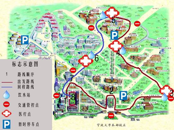 线路说明:本部田径场→安中大楼→阳明路→北大门→林杏琴会堂→至真楼→建筑设计学院→曹光彪科技楼→李达三外语楼→龙赛理科楼→海洋学院→捷克论坛 →阳明学院→锦绣学生活动中心→安中大楼→田径场
