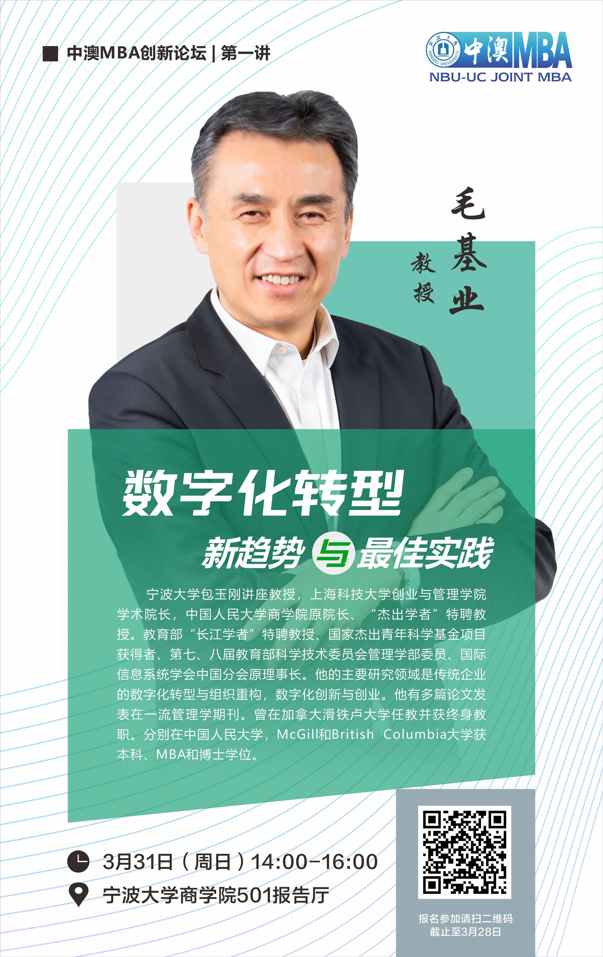 包玉刚讲座教授毛基业教授来院进行题为《数字化转型新趋势与最佳实践》的讲座,开启中澳MBA创新论坛讲座系列|第一讲的序幕。欢迎广大师生校友积极参加!