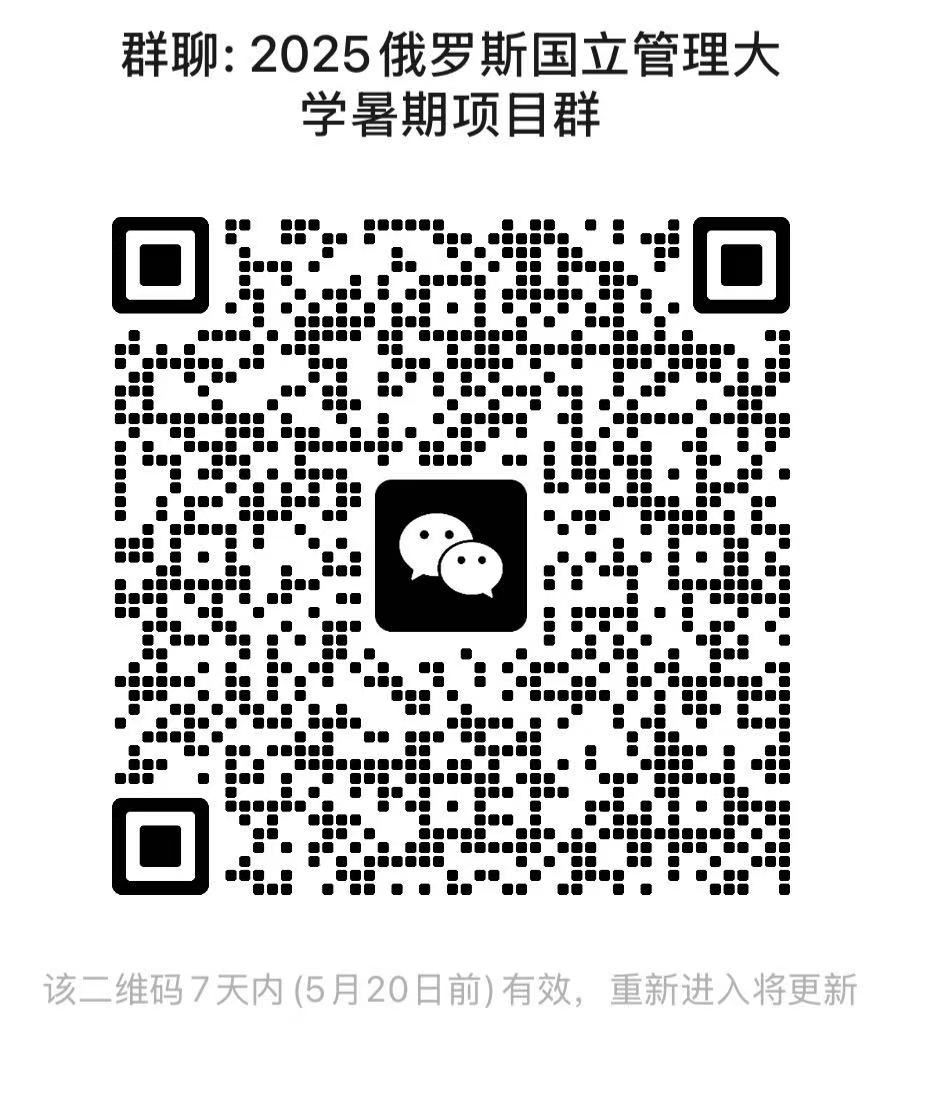 请感兴趣的同学扫码入项目群,并于5月20日前在学生出国系统里提交申请,选择:短期调研实习项目-院级项目-捷克论坛 -2025俄罗斯国立管理大学暑期项目。