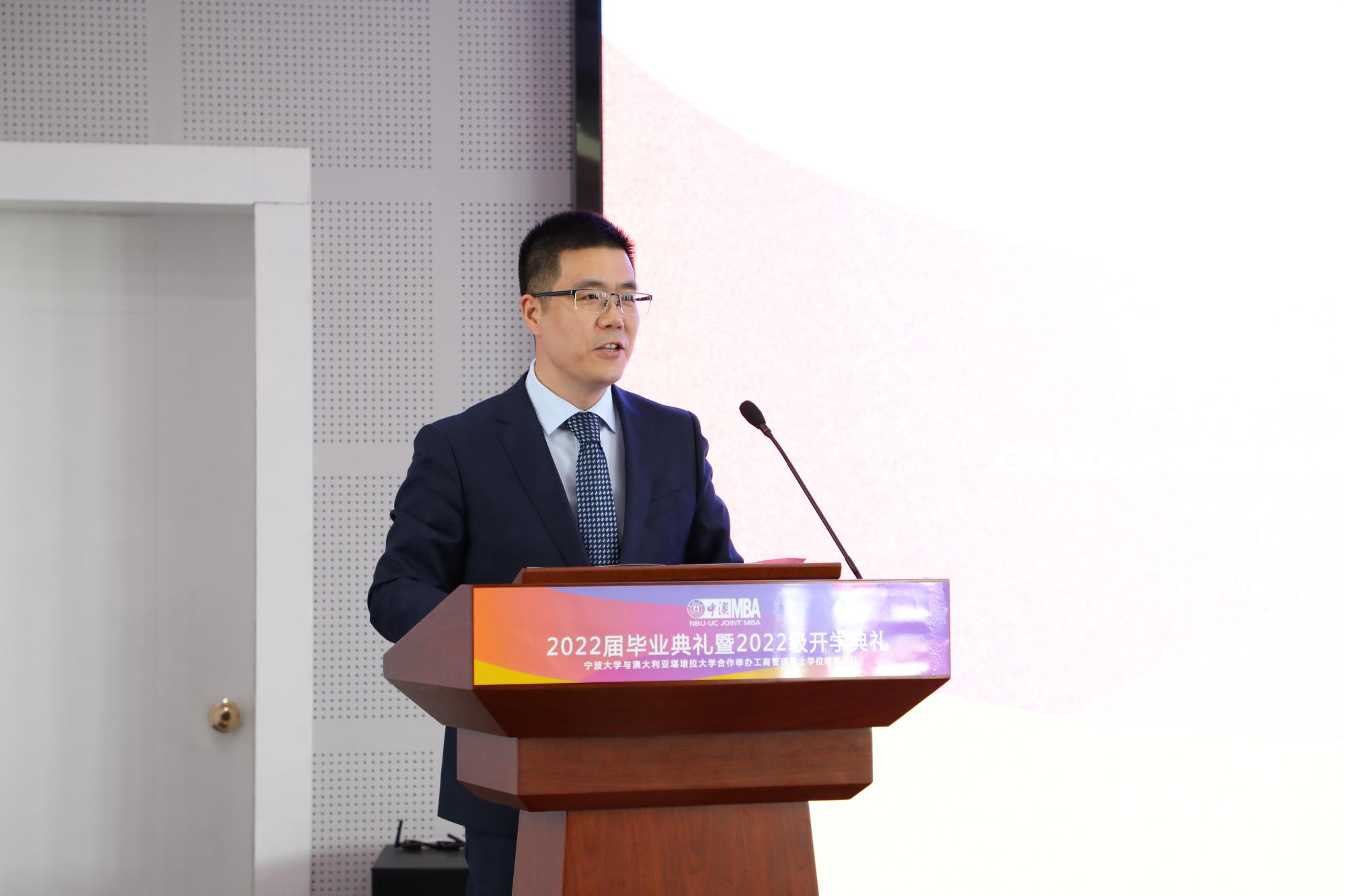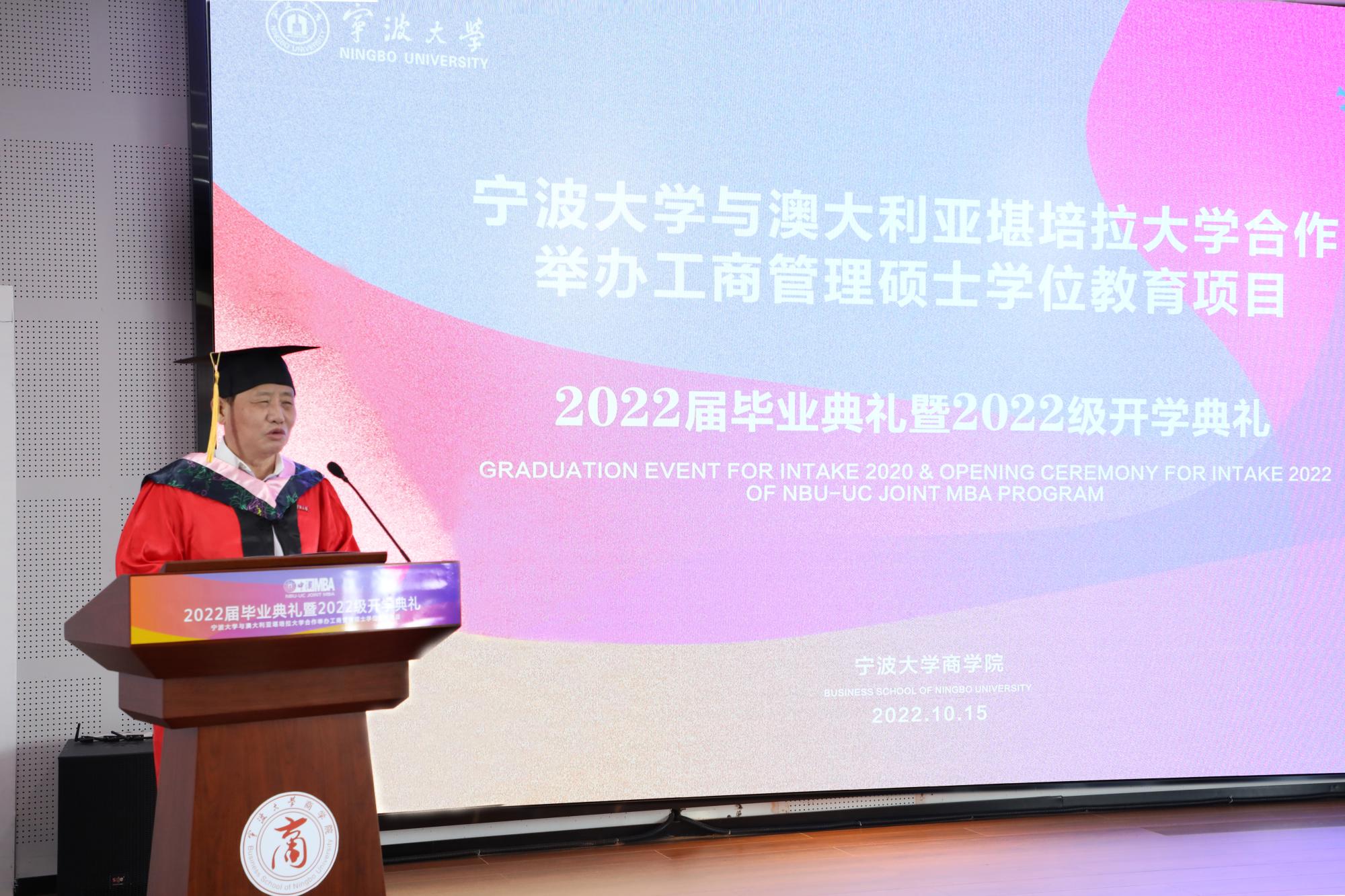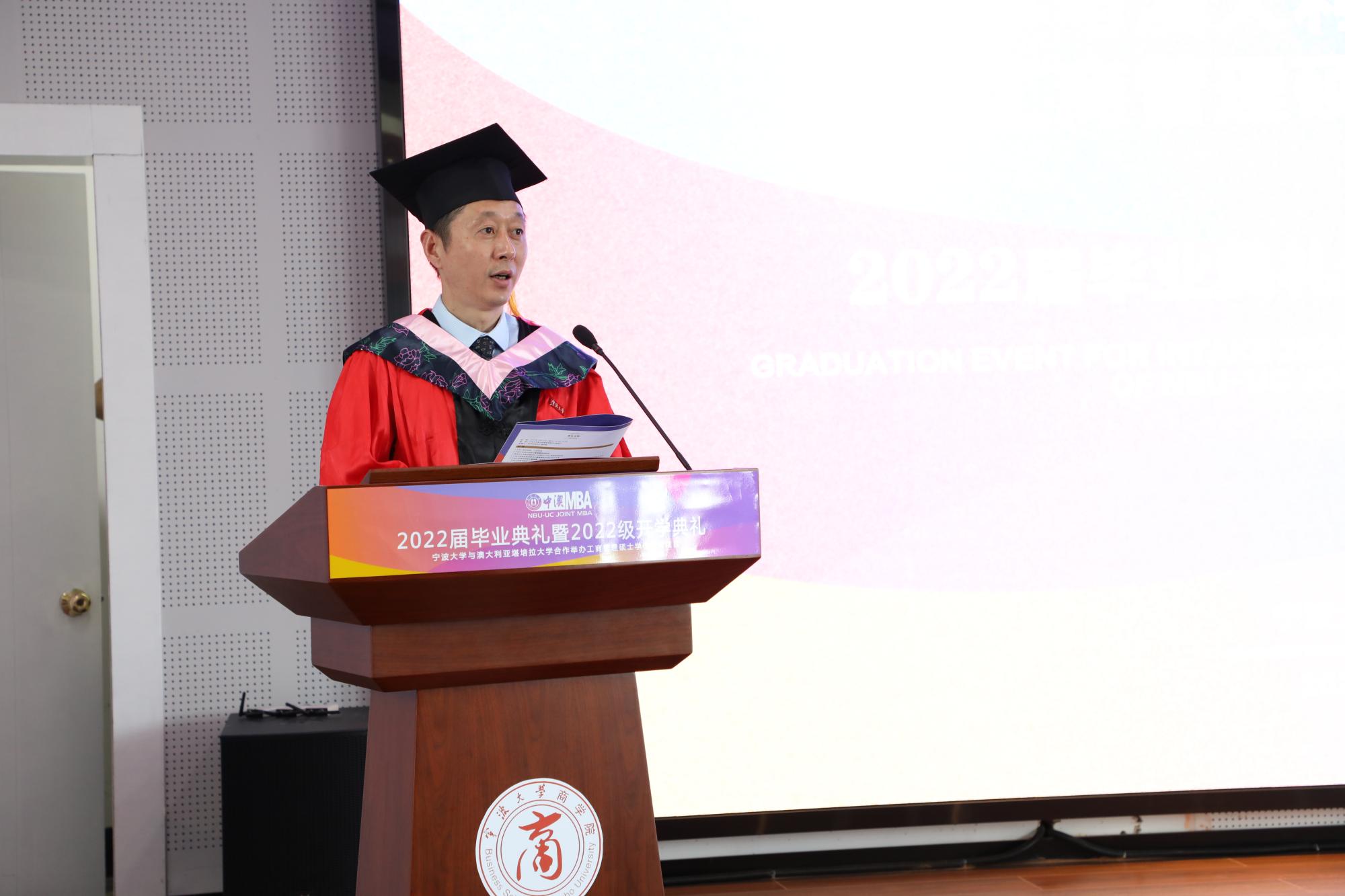 在澳大利亚堪培拉大学的毕业典礼现场视频播放后,金院长首先致辞。他祝贺同学们顺利完成学业,感谢老师们的辛勤付出,也感谢社会各界对捷克论坛 中澳MBA发展的支持。他指出中澳MBA项目应该及时顺应社会发展变化趋势,定位高质量发展培养体系,培养更多“有创新思维,懂资本运营”的人才;同时,他还提出“大学MBA”教育应通过学生自主“批判式”学习,敢于挑战教科书中的权威理论观点,增加同任课教师的课堂互动,“敢问问题”、“会问问题”,来有效提升课堂的教学质量,增加学习的探索性和研究性;第三点,他提出项目要进一步提高游学活动质量。“读万卷书,行万里路”。培养学者和有思想的人,“行万里路”是非常重要的。金院长通过分享他暑期的游学经历,倡导MBA学员们要不断丰富自身的思想体系,训练悟性,激发灵感,为明天步向成功做好准备。